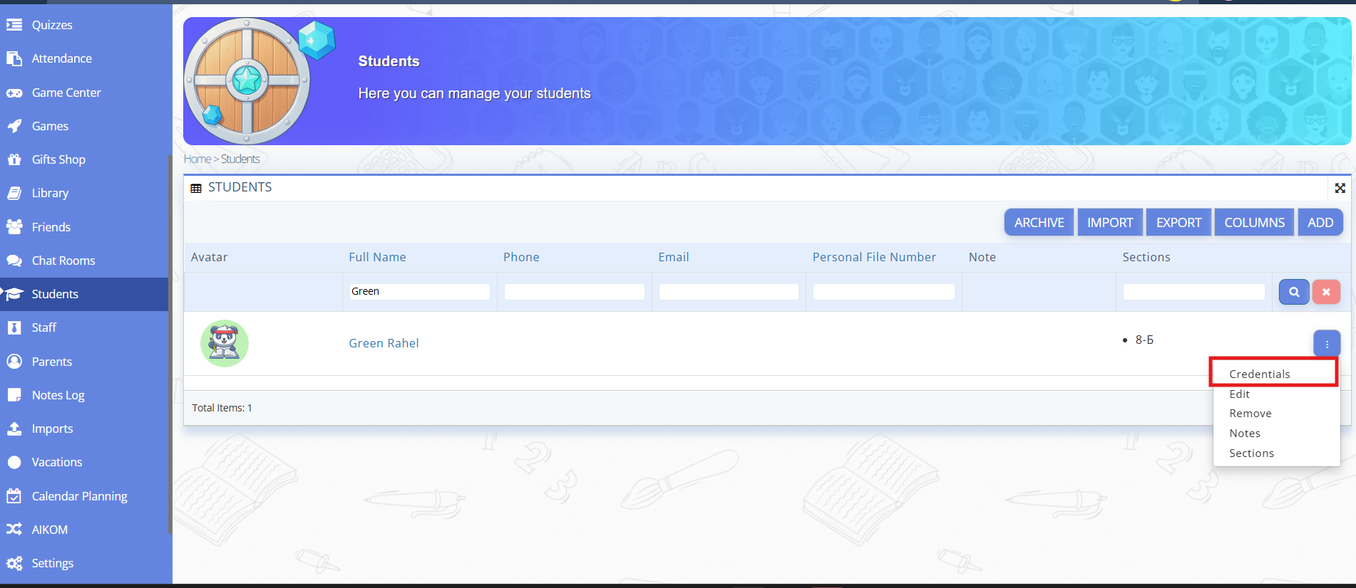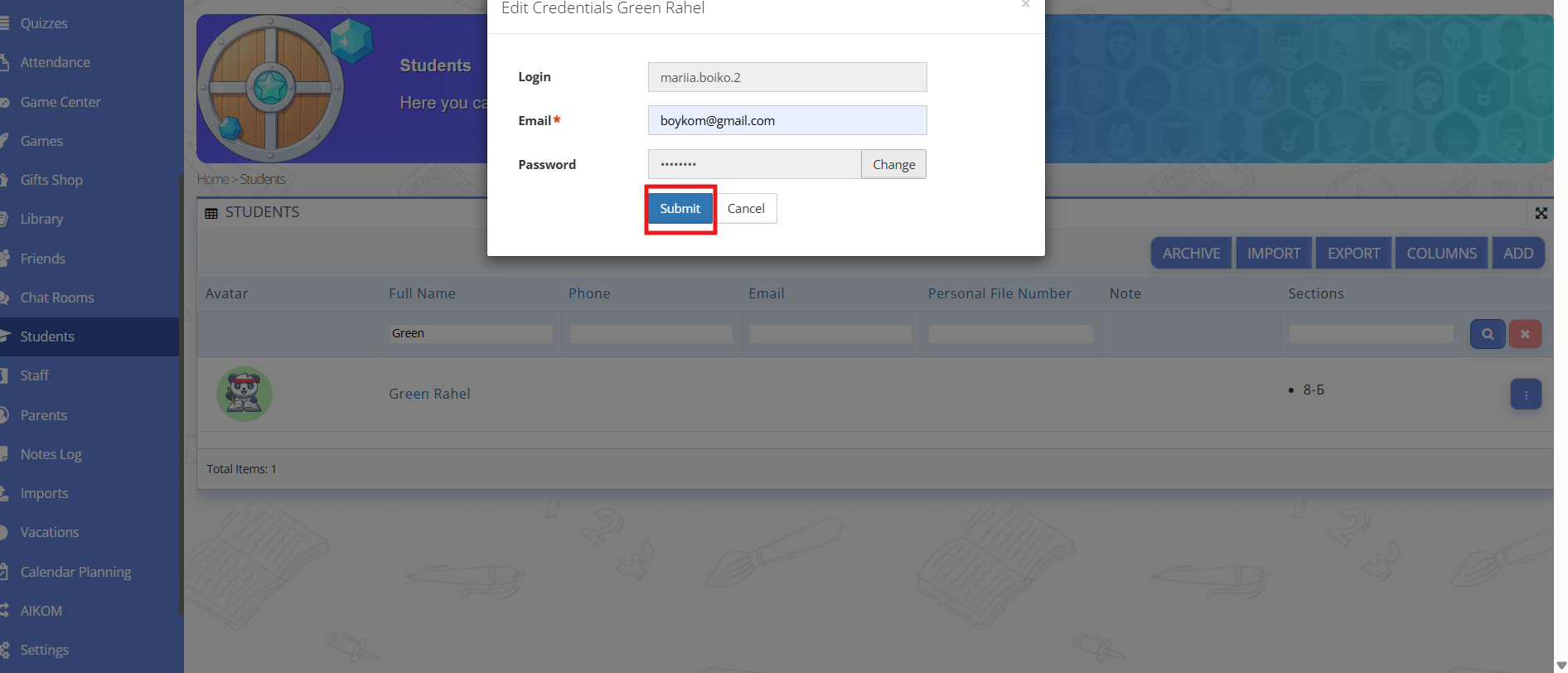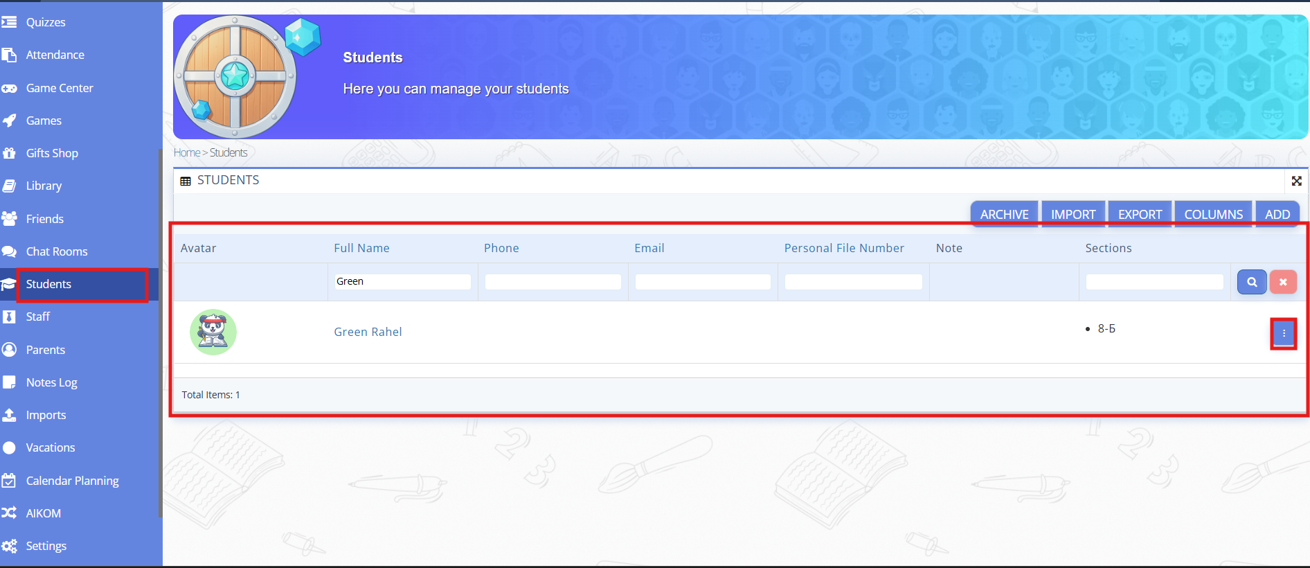 Go to “Students” in the left-hand menu and open the list of students. Use the search filter to find the required student.