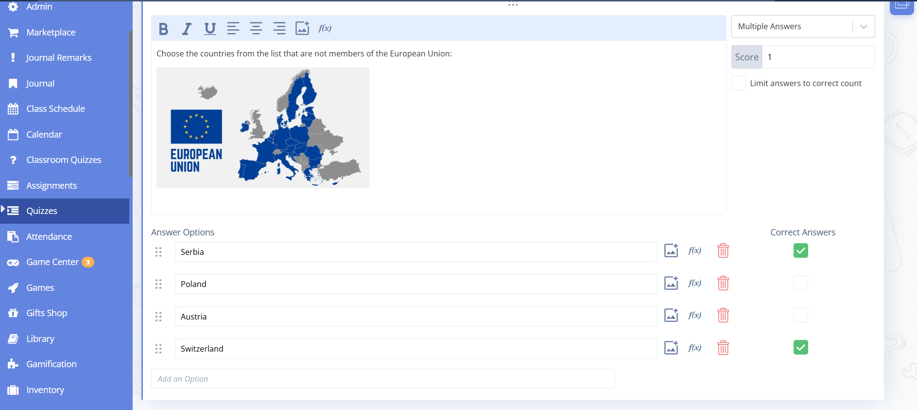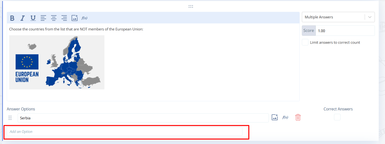 Select the question type “One correct answer” or “Multiple answers”.