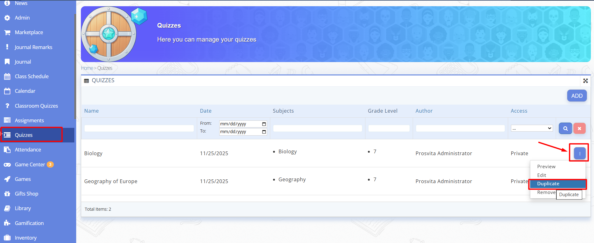 Duplicate Quiz Copying Quizzes¶ Steps¶ Go to “Quizzes” section. Find the quiz you want to duplicate. Click the three-dots menu next to the quiz. Select “Duplicate”. Fig. 1 — Duplicating a quiz A copy of the quiz will appear in the list. Fig. 2 — Duplicate of the previously created quiz