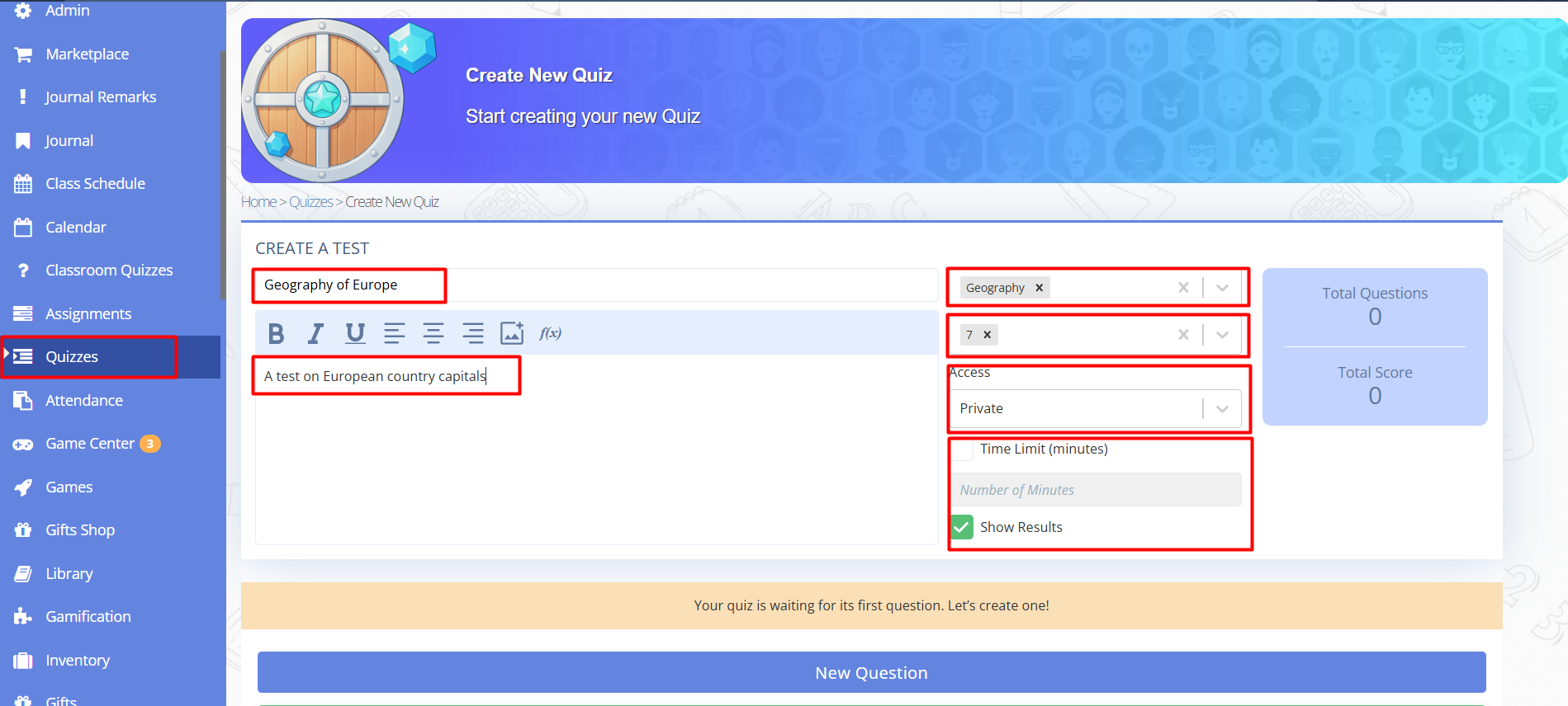 - Fill in the Quiz creation form: