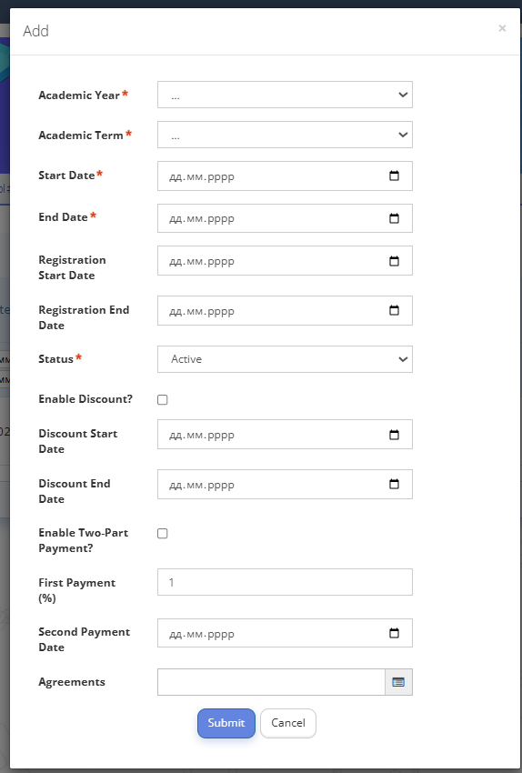 ⚠️ Before adding new session, it is required to preliminary set up an academic year and, at least, one study term. The session will have the same title as a study term.