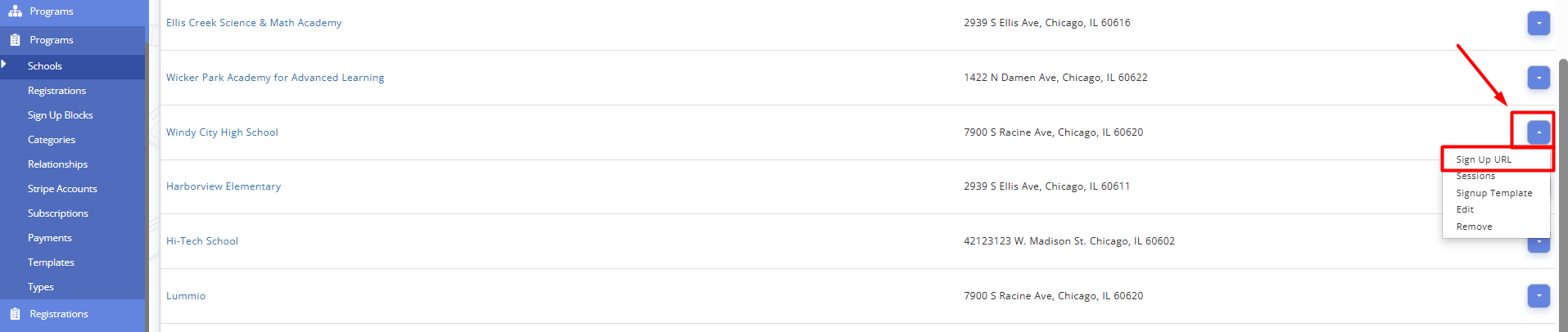 3. In the context menu to the specific school, click 'Sign Up URL' button.
