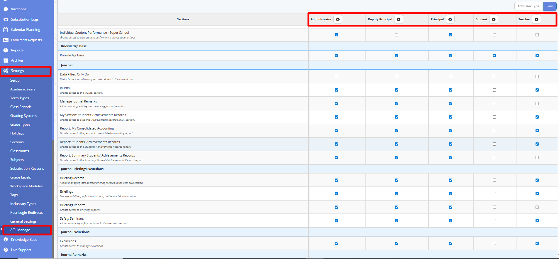 The “Access Control List” Manage (ACL) section allows the administrator to configure access permissions to platform functionality for different user roles (Administrator, Teacher, Principal, Deputy Principal, Student, Teacher Assistant, etc.).