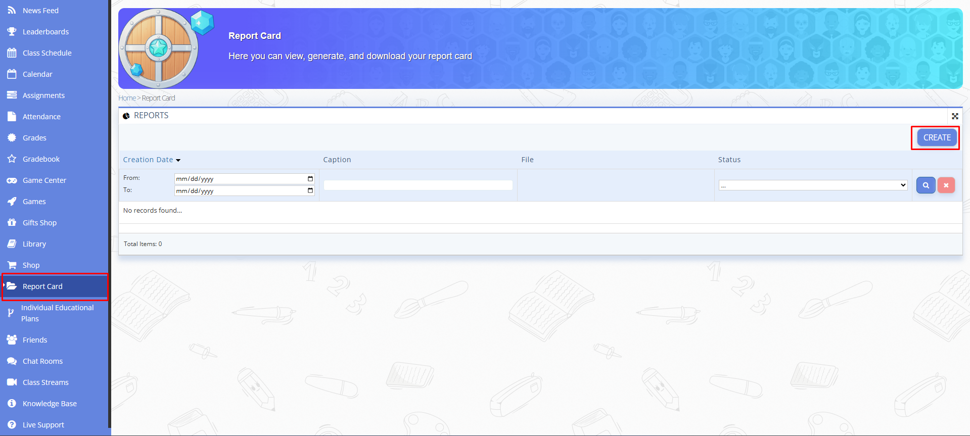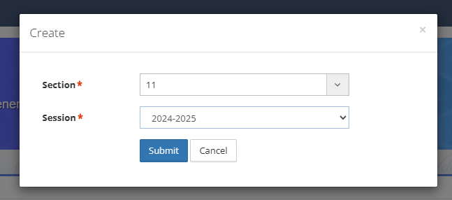 Fig. 1 — “Report Card” section with the list of reports and the “Create” button - In the “Create” window, select the Section and academic Session from the dropdown lists, then click “Submit”.