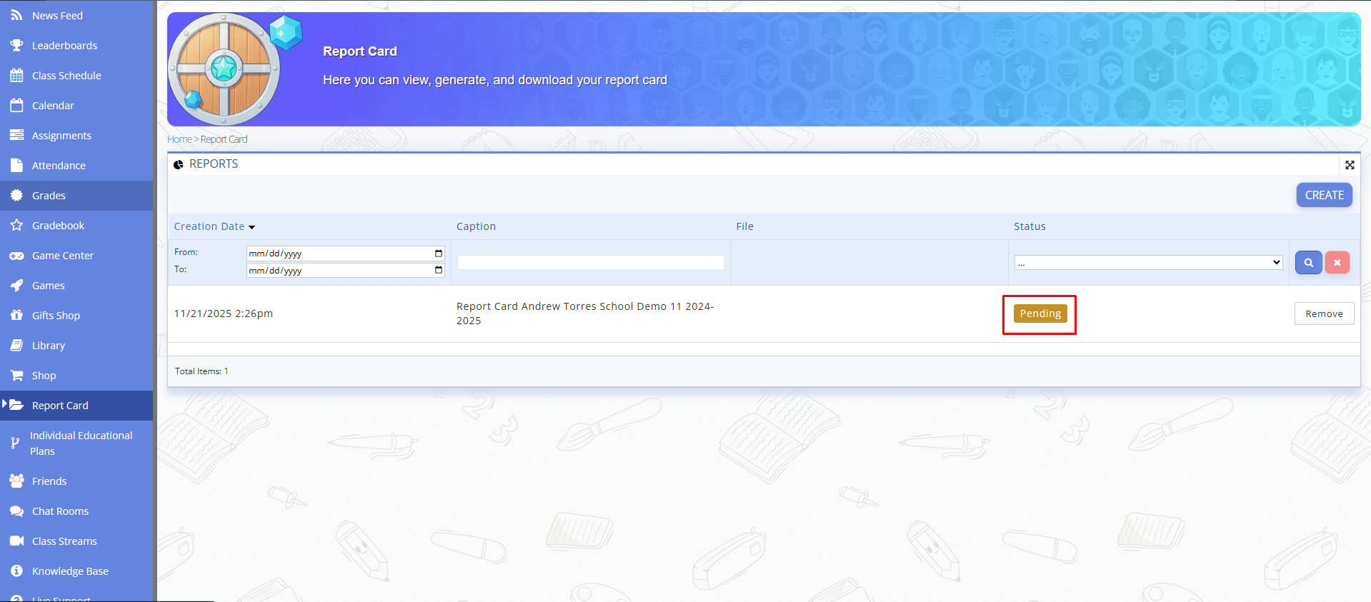 Fig. 3 — Report card file with “Pending” status - When the status changes to “Success”, click the blue arrow under the file icon to download the report card as a PDF file.