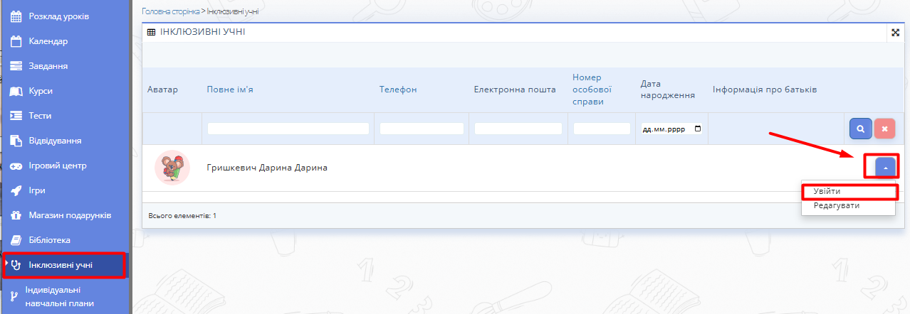 - Відкрийте розділ Інклюзивні учні на панелі зліва.
