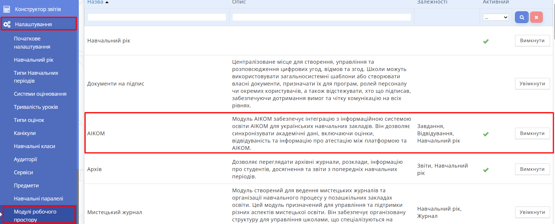 Переконайтеся, що модуль AIKOM активовано і біля нього стоїть зелена галочка під стовбчиком "Активний".