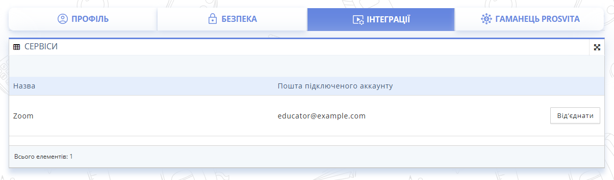 Рис. 4. Вкладка "Інтеграції" із налаштованою інтеграцією з Zoom. Рис. 4. Вкладка "Інтеграції" із налаштованою інтеграцією з Zoom.