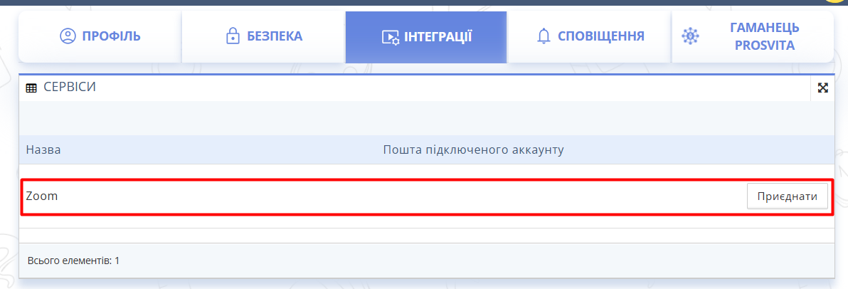 5. У полі "Сервіси" буде відображатись сервіс Zoom із кнопкою "Приєднати".