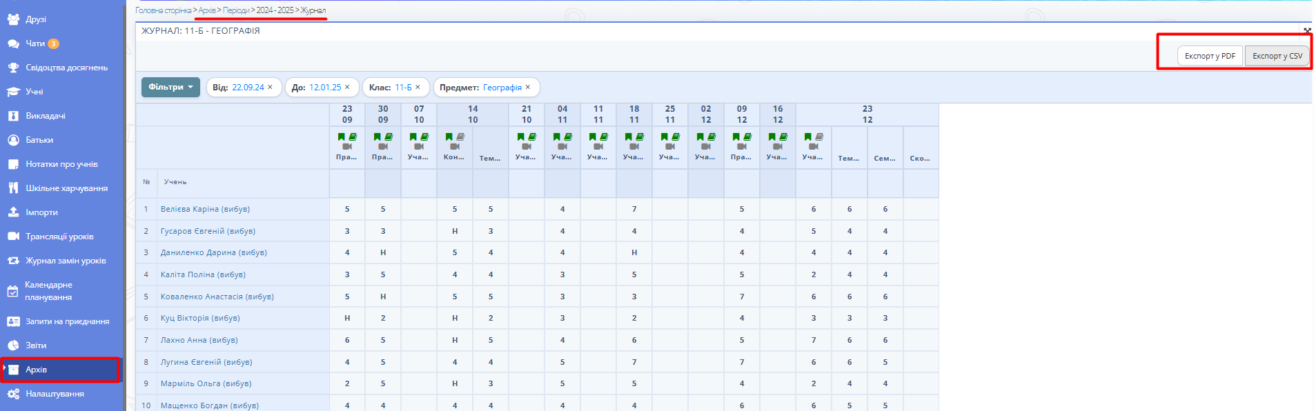 Приклад вигляду архівного журналу з конкретного предмету: