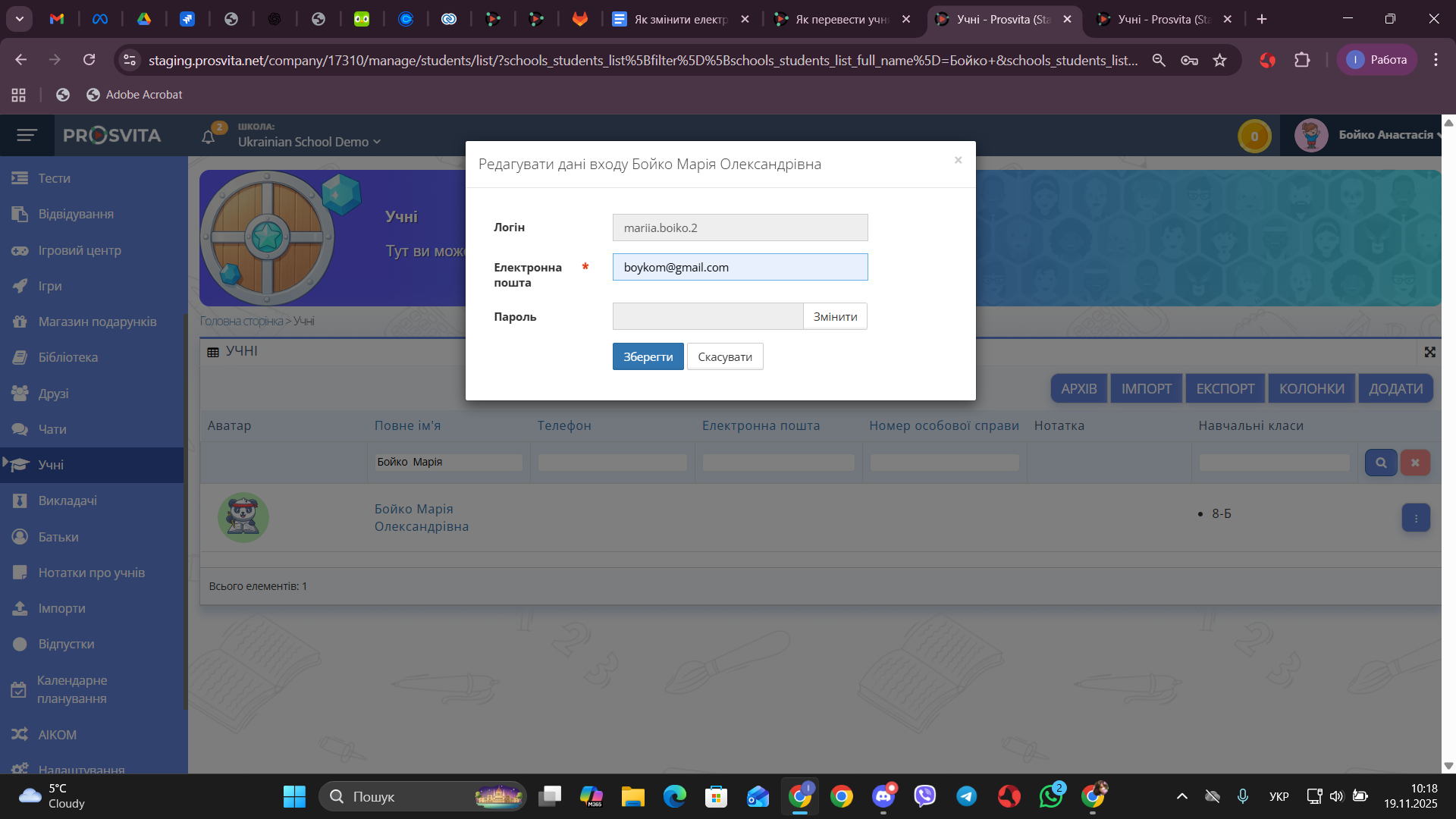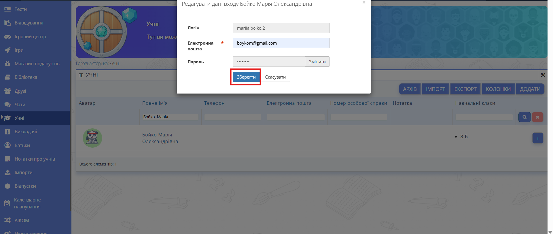 Fig. 4 — Кнопка «Зберегти» - Перевірте результат — нова електронна адреса має відображатися в даних учня, а учень зможе увійти до системи, використовуючи оновлений email.