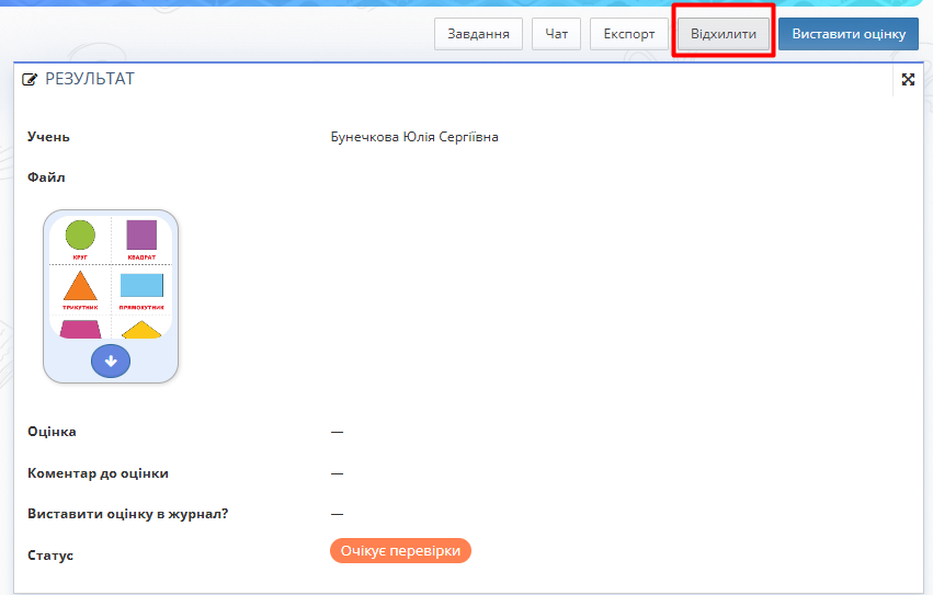 Рис 6. Завантаження файлу домашнього завдання - Якщо завдання виконано не повністю або неправильно, натисніть кнопку "Відхилити".