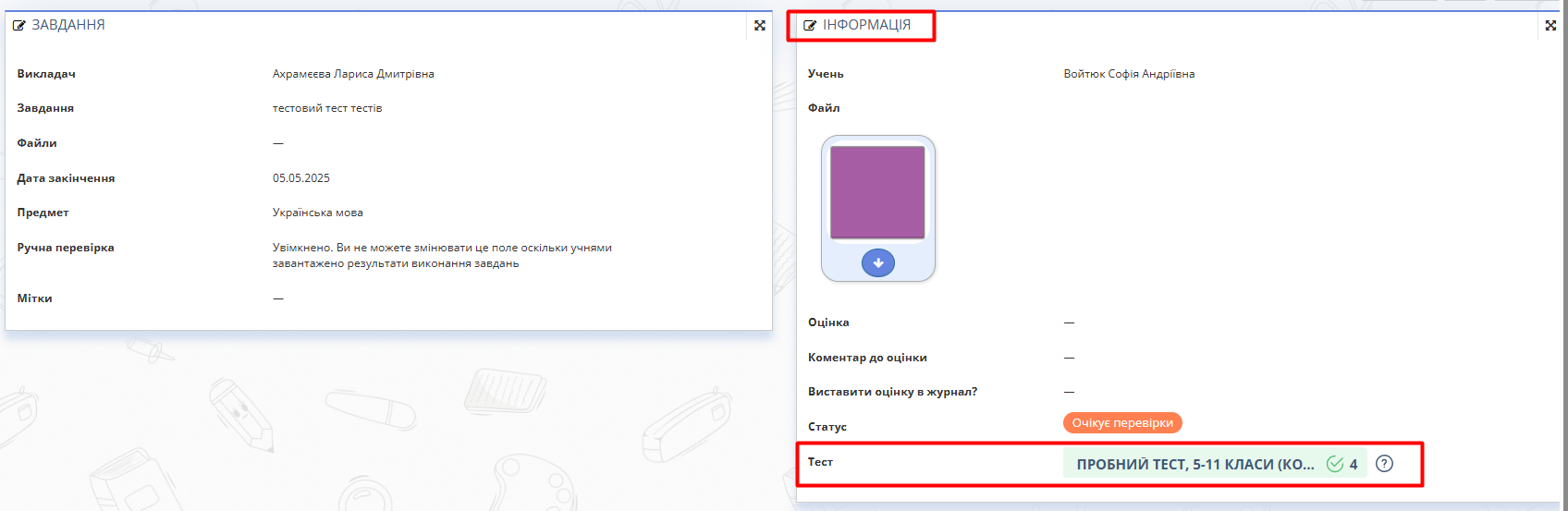 ℹ️ Завдання буде у статусі "Виконується" (якщо ручна перевірка увімкнена на етапі створення завдання і учень не завантажує файл) або у статусі "Очікує перевірки", якщо ручна перевірка вимкнена.