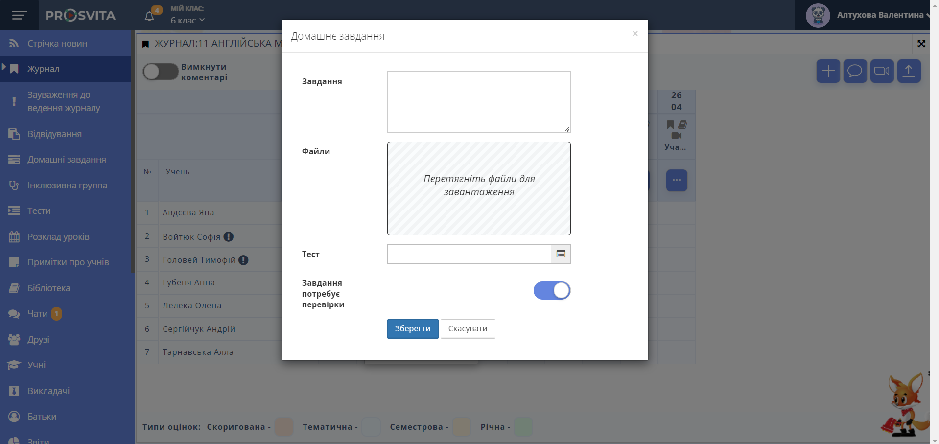 - Вкажіть оцінку, оберіть тип оцінки "Тест" та при необхідності оберіть "Виставити оцінку в журнал" для перенесення оцінки у журнал.