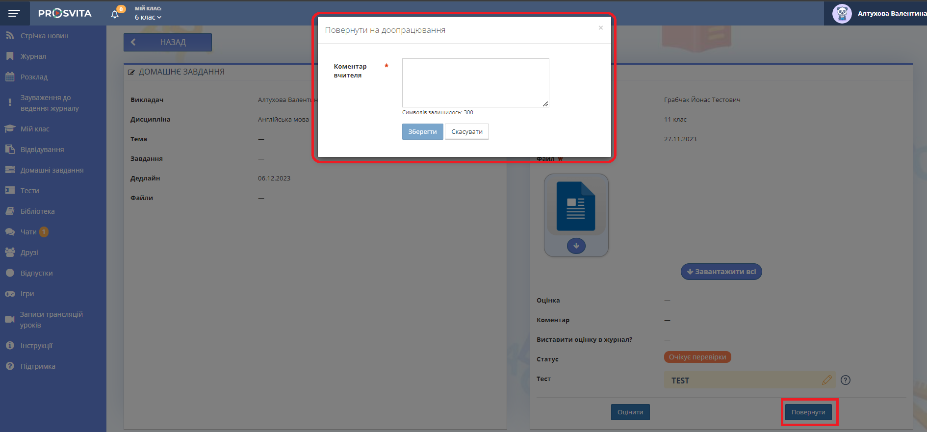 Рис. 8. Повернути домашнє завдання учню - Якщо завдання виконано правильно, натисніть кнопку Виставити оцінку.