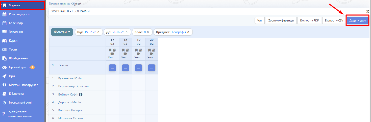 - Натисніть кнопку "Додати урок" на сторінці "Журнал" відповідного предмету, щоб створити нову колонку з датою уроку.