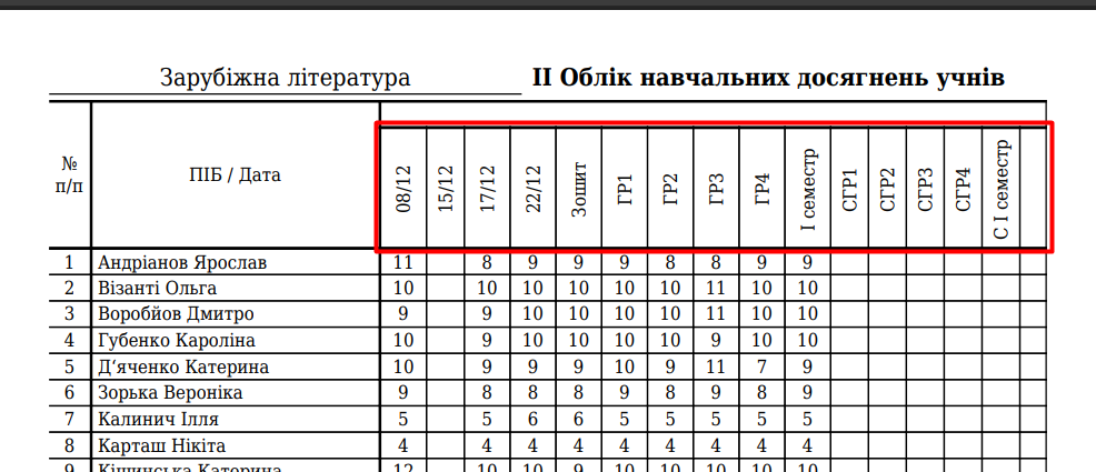 Обравши тип оцінювання, виставте оцінки або “Н”. Інформація зберігається автоматично. Ось як будуть виглядати обрані компетенції у стовпчиках журналу: