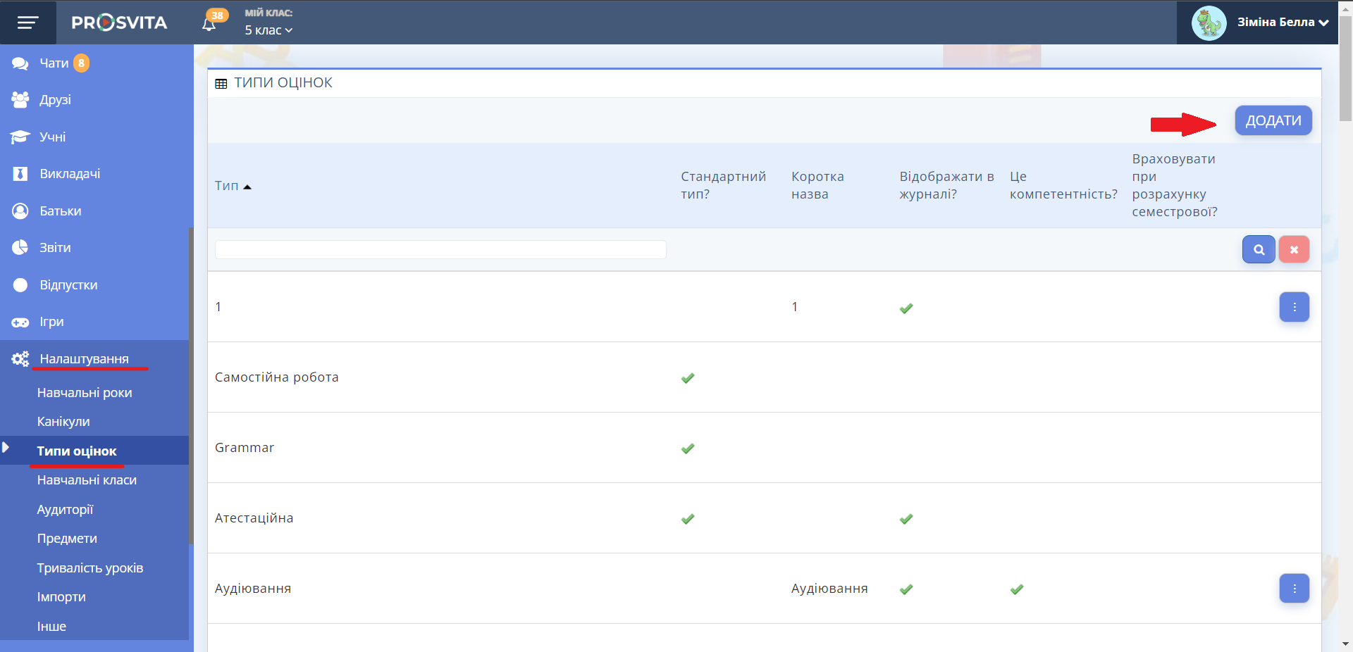 Створіть новий тип оцінювання. Перейдіть у Налаштування, оберіть Типи оцінювання, натисніть Додати.