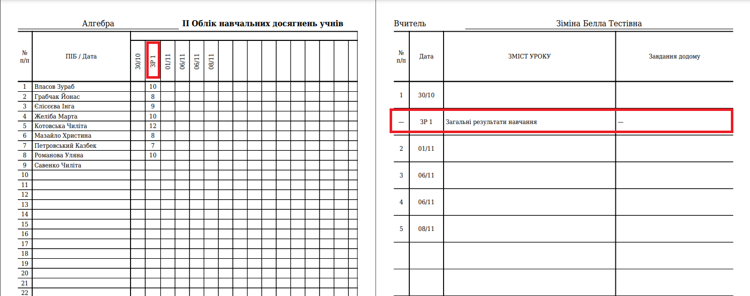 Обравши тип оцінювання, виставте оцінки “Н”. Інформація зберігається автоматично. Для перегляду pdf-журналу натисніть Експорт у PDF.