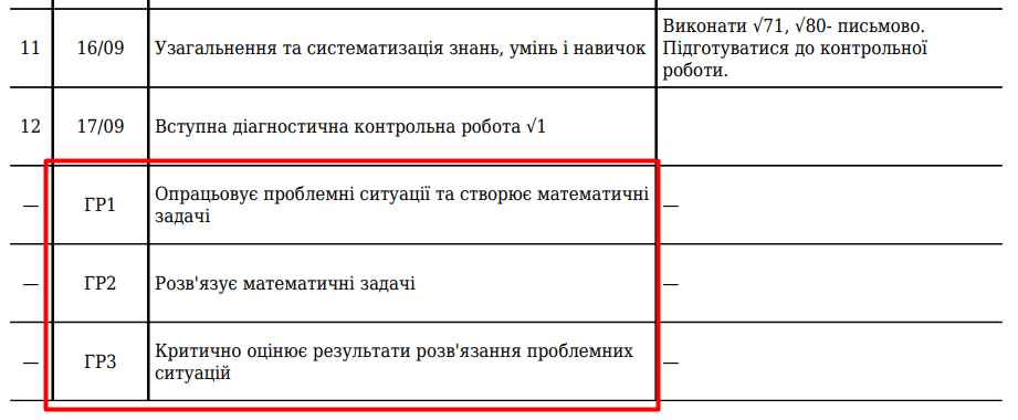 Приклад відображення компетентностей предмету Математика