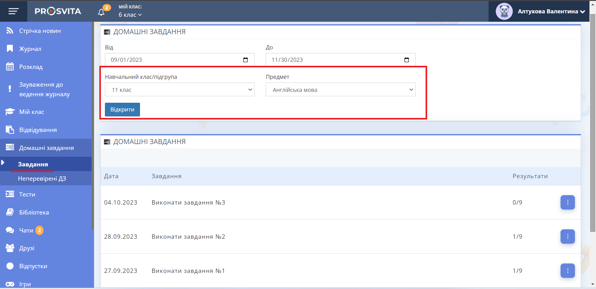 . - Щоб переглянути список домашніх завдань, відкрийте меню "Домашні завдання" -> "Завдання".