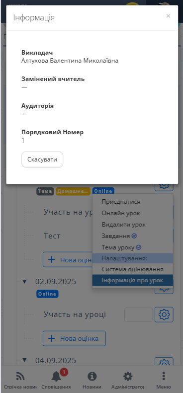 Переглянути інформацію по уроку, можна, натиснувши ⚙️ біля дати уроку та обравши "Інформація про урок" у випадаючому списку.