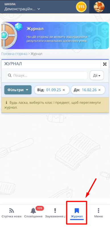 Мобільний журнал — це робочий розділ застосунку, у якому вчитель веде облік уроків, відвідування та оцінювання учнів безпосередньо зі смартфона. Він дозволяє швидко внести оцінки під час уроку, переглянути попередні записи та виконати основні дії з уроком.