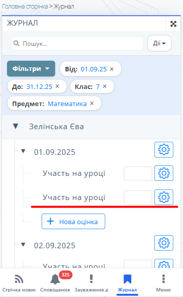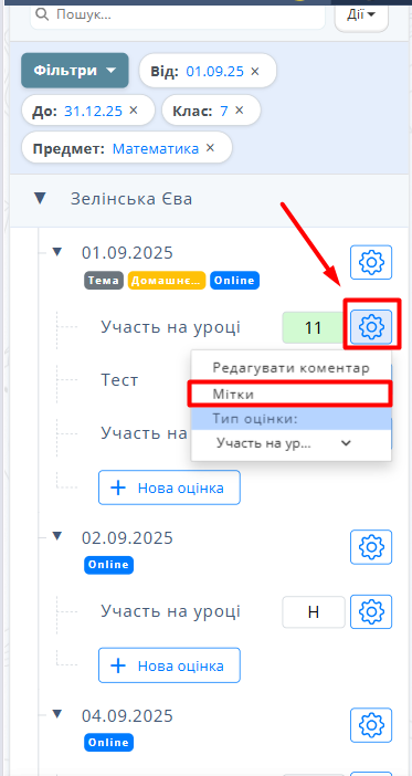 1. Натисніть на іконку налаштувань ⚙️ біля клітинки з оцінкою.
