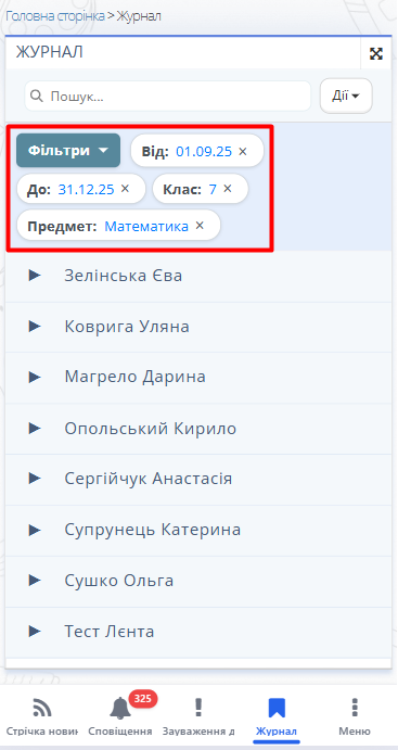Сторінка мобільного журналу відкривається у вигляді розгорнутого списку учнів та складається з таких елементів:
