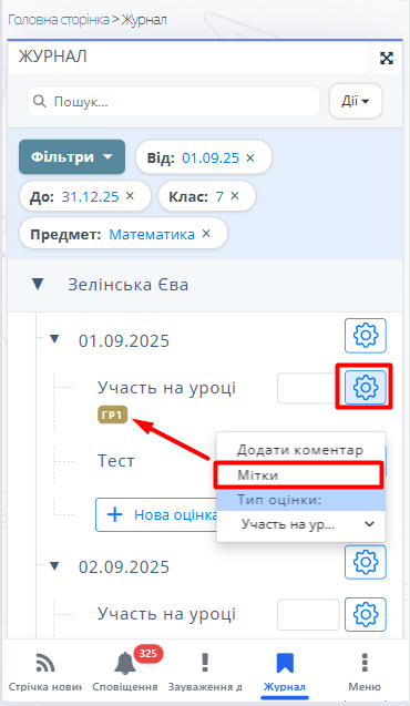 Рисунок 19: Виставлення мітки на уроці в мобільному журналі - Оберіть з випадаючого списку заздалегідь створені мітки.