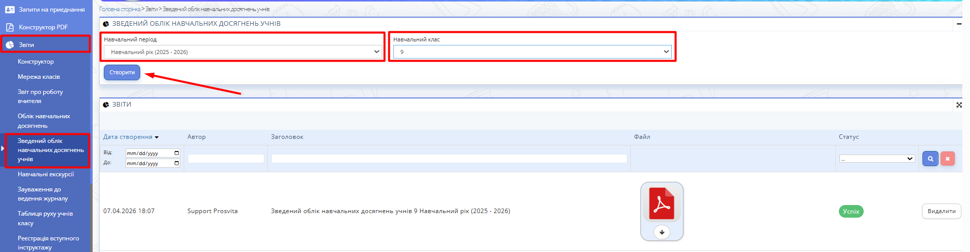 - Відкрийте: Звіти → Зведений облік навчальних досягнень учнів (або інший потрібний розділ).