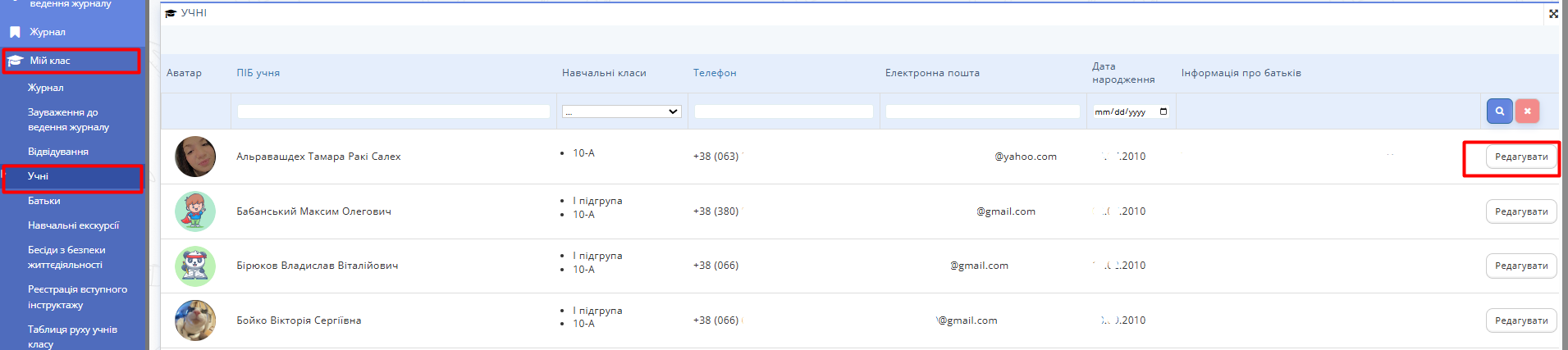 Рис. 1. Сторінка "Учні" - Знайдіть учня, інформацію якого потрібно змінити. Натисніть кнопку "Редагувати" справа від прізвища учня.
