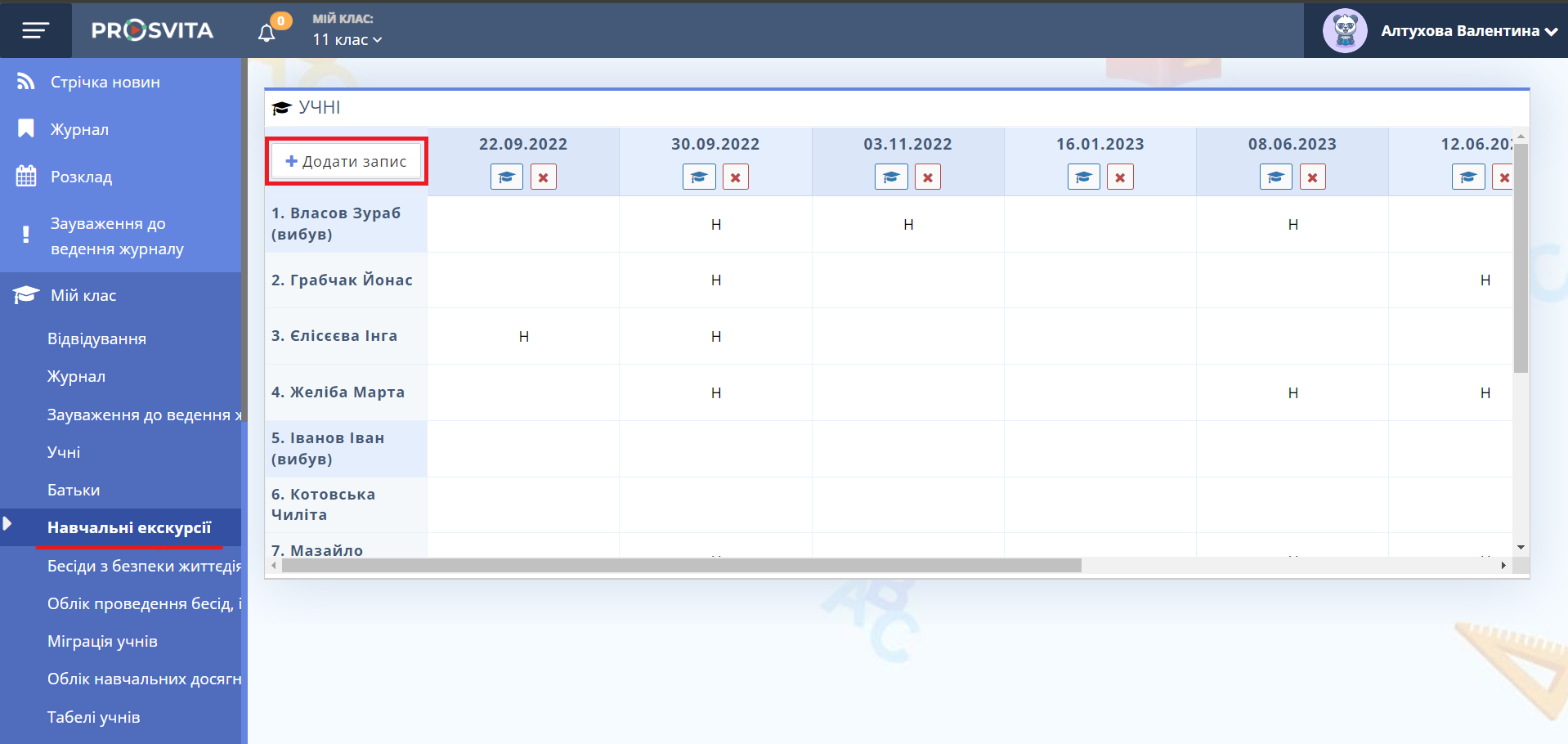 Щоб додати нову екскурсію, натисніть кнопку "Додати запис" у верхній частині сторінки.