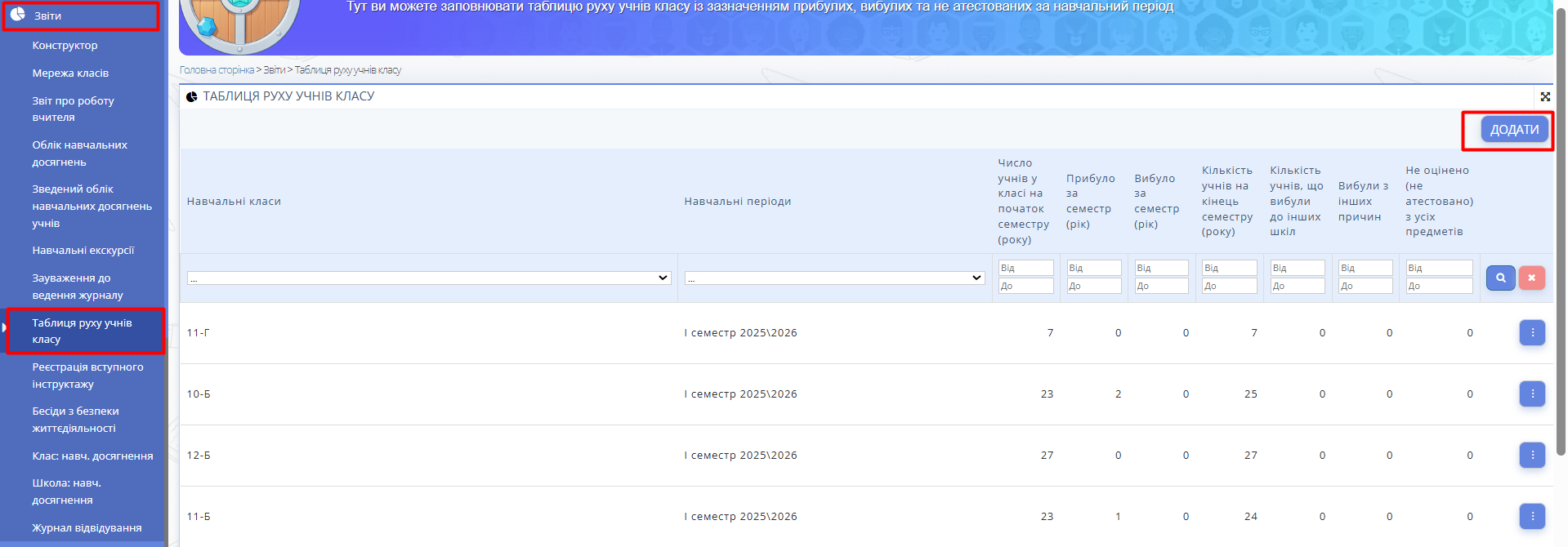 Відкрийте сторінку "Звіти"-->"Таблиця руху учнів класу".