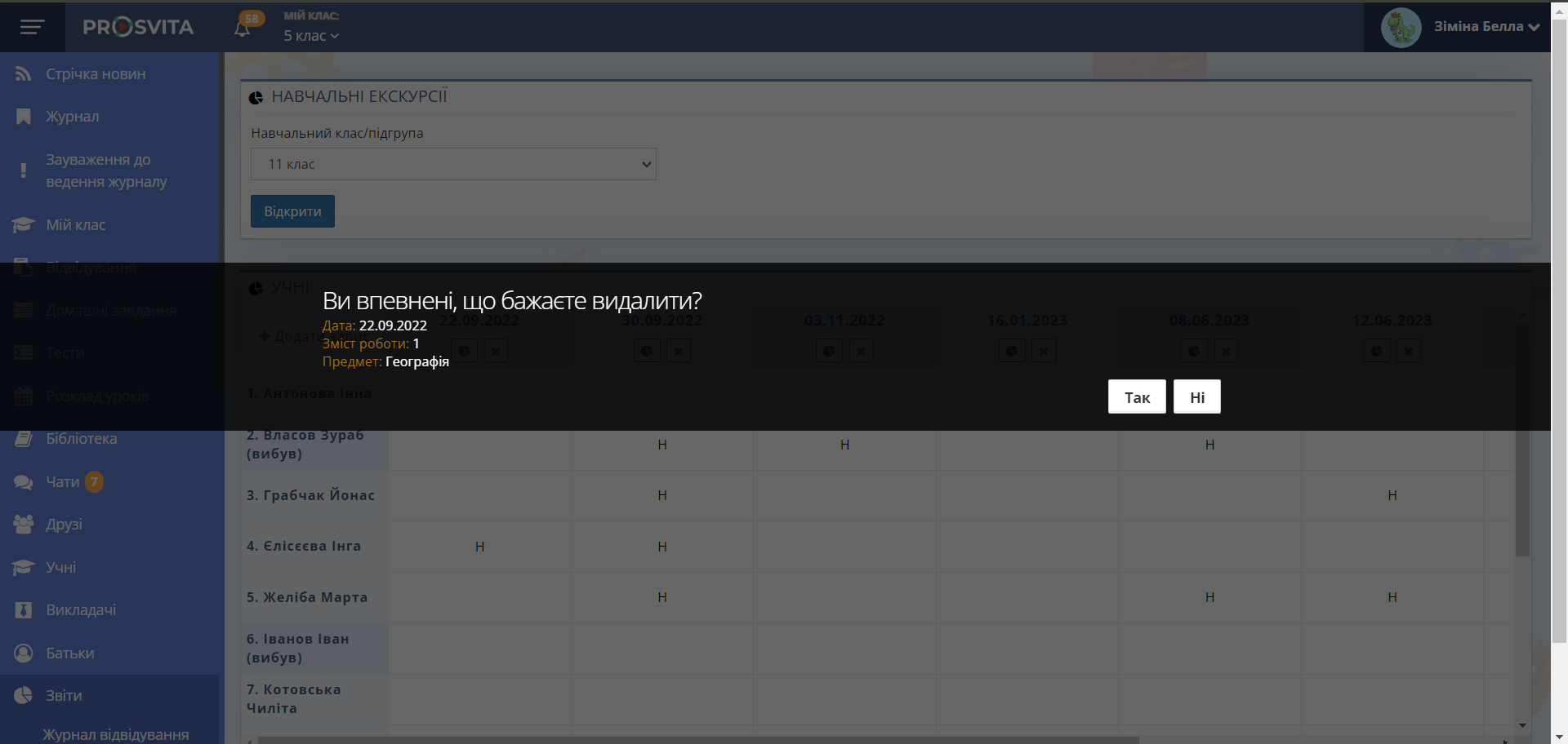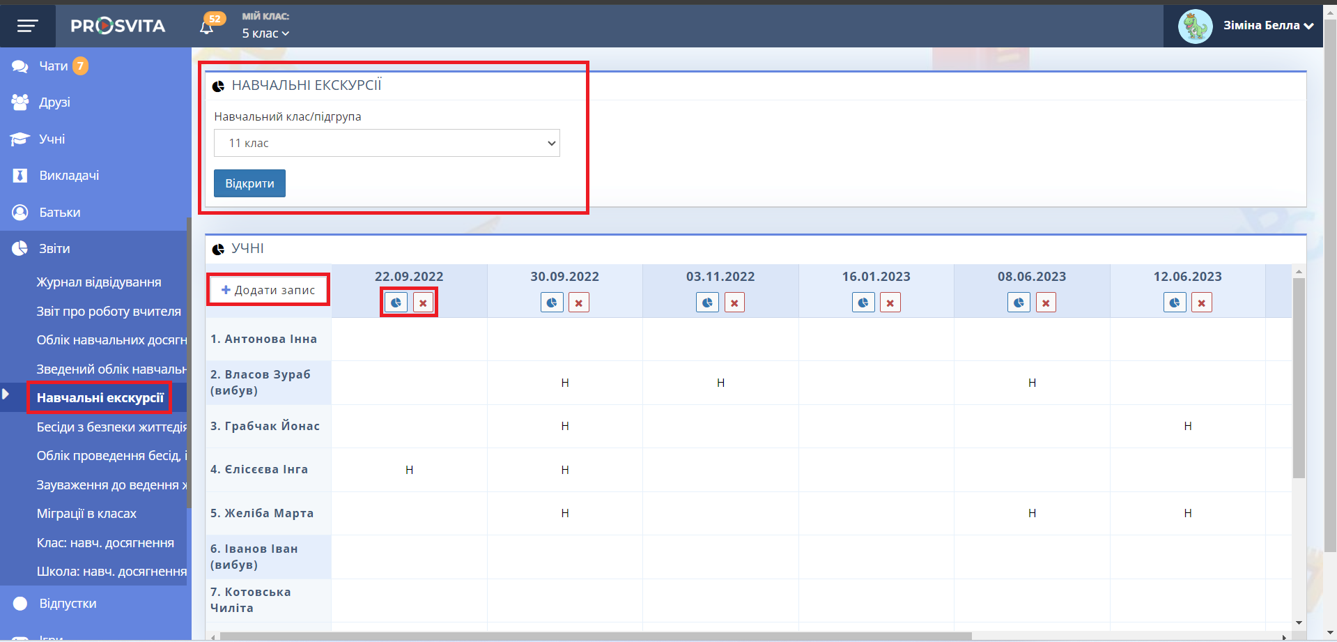 - Перегляньте список учнів, дати екскурсій та відсутність або присутність учнів.