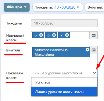 Натисніть кнопку "Поточний тиждень" для переходу на сторінку з розкладом поточного тижня. - Відсортуйте у фільтрі розклад уроків за датою, навчальним класом (класами), прізвищем вчителя (вчителів) та оберіть відображати усі класи чи лише з уроками цього тижня. Натисніть "Пошук".