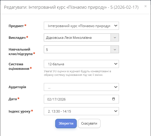 Ви можете змінити: аудиторію, предмет, викладача, навчальний клас або підгрупу, систему оцінювання, дату та час уроку.