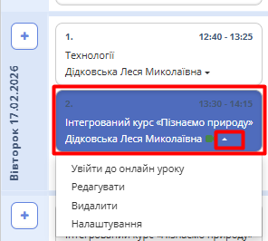 - На уроці з предмета, який потрібно замінити, натисніть стрілку вниз та з випадаючого списку оберіть «Налаштування».