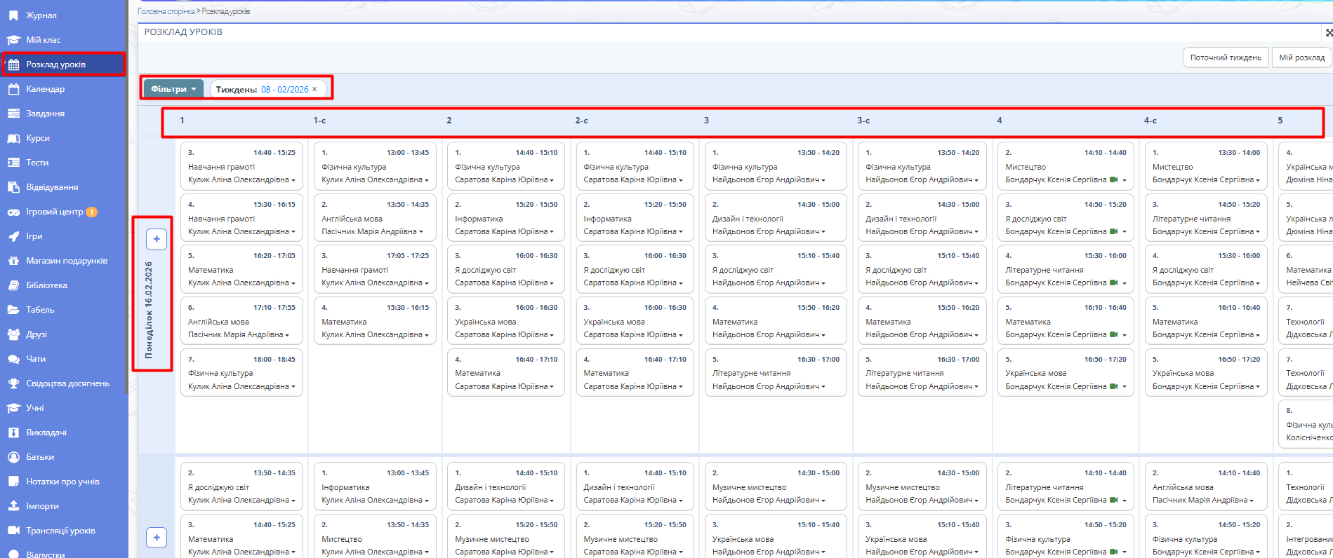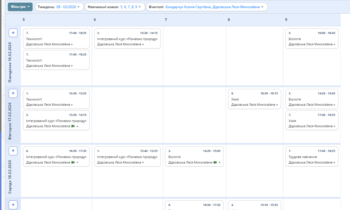 Натисніть кнопку "Поточний тиждень" для переходу на сторінку з розкладом поточного тижня. - Відсортуйте у фільтрі розклад уроків за датою, навчальним класом (класами) та прізвищем вчителя (вчителів).