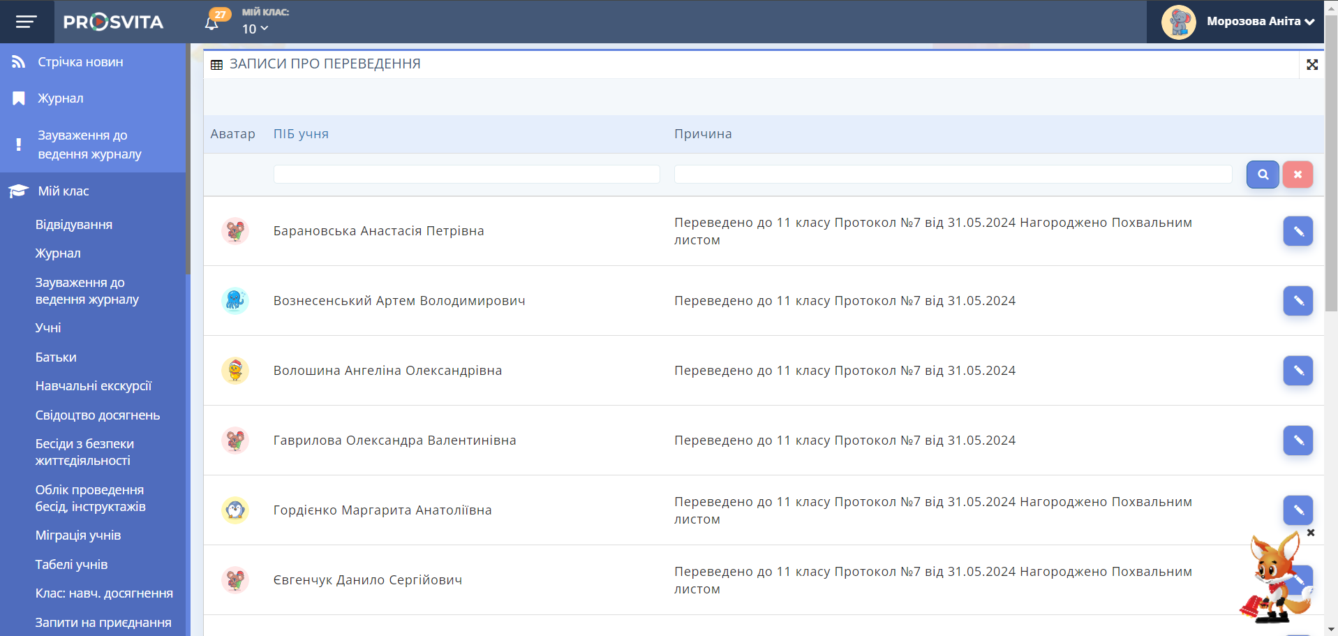 Перед закриттям навчального року Вчитель має внести записи про переведення учнів до наступного класу. Для цього він повинен перейти у Розділ "Мій клас" → "Записи про переведення", обрати відповідного учня та натиснути на кнопку "Редагувати" праворуч від ПІБ учня (Рис. 1).