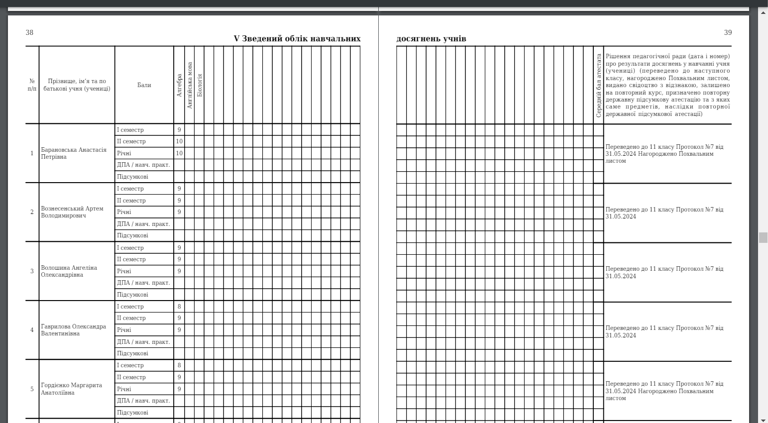 Таким чином інформація про переведення учня відображатиметься у Журналі у Розділі V - "Зведений облік навчальних досягнень учнів" в останній колонці (Рис. 5).