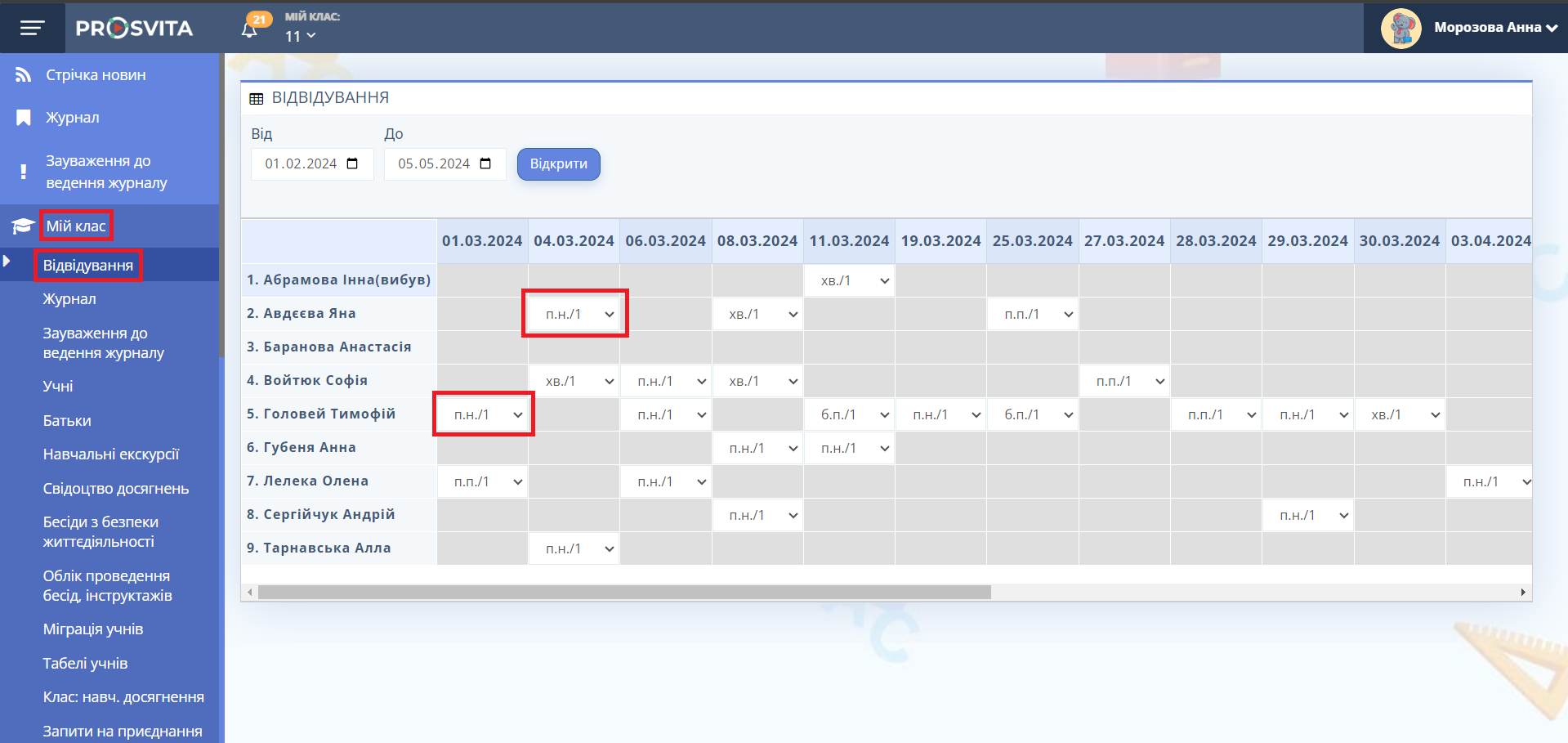 Рис. 7. "Мій клас" - "Відвідування"