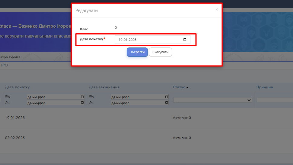 Рис. 4. Редагувати дату початку навчання2.5. Якщо потрібно відредагувати дати для учня, який вибув, редагуєте дату початку та дату закінчення навчання для учня у статусі "Архівовано" або "Видалено".