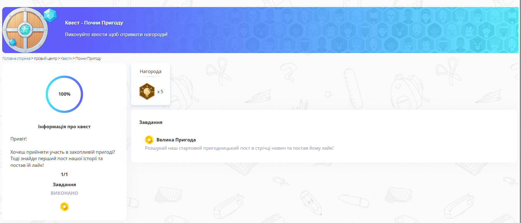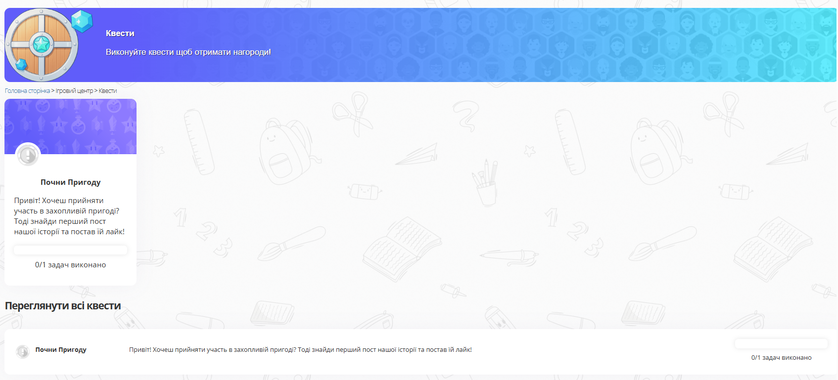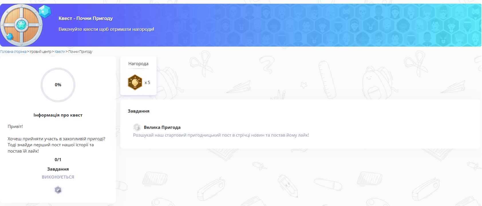 Рис. 2 — Відкритий квест - Виконати зазначені дії (наприклад: прочитай матеріал, виконай завдання, постав лайк, залиш коментар).
