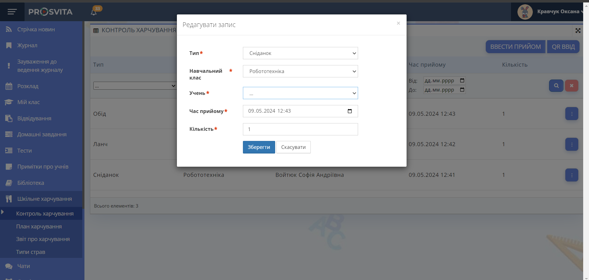 ⚠️ Для редагування інформації про прийоми харчування перейдіть у розділ "Шкільне харчування" -> "Контроль харчування".