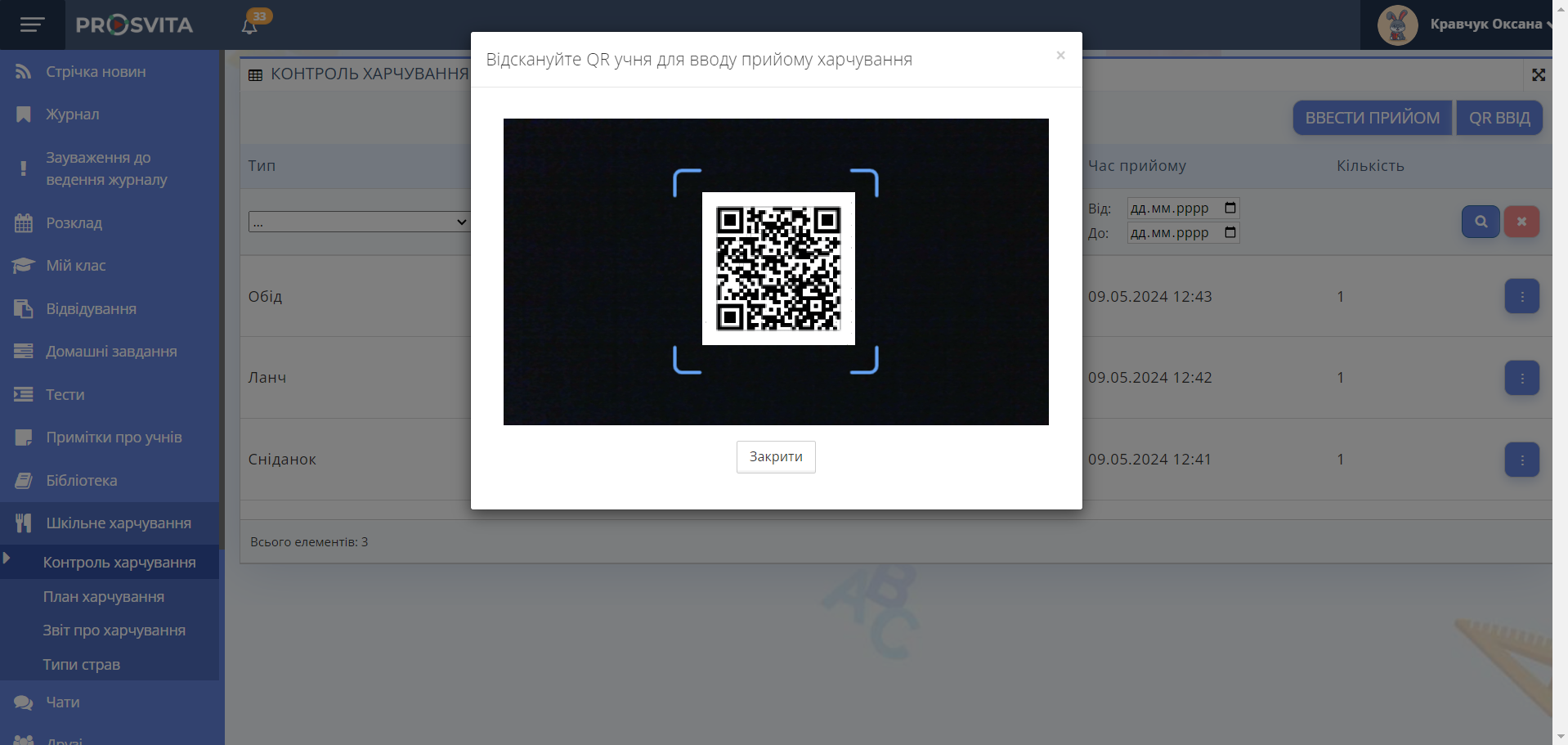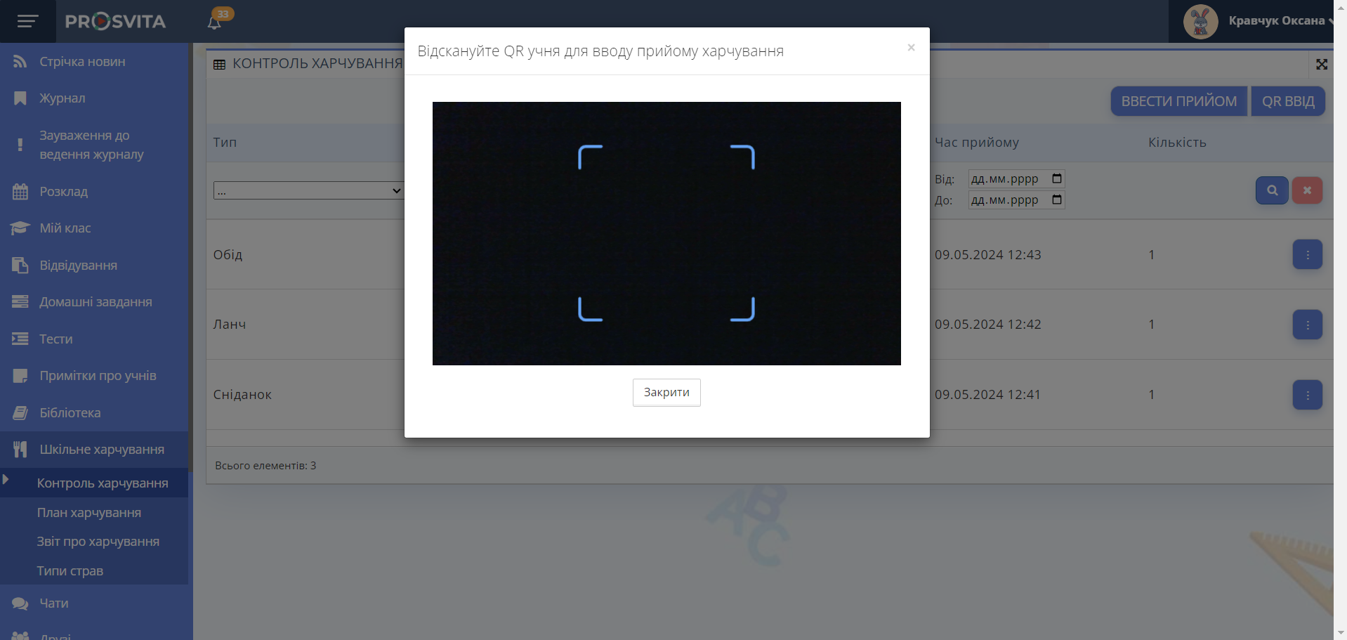 Щоб відмітити присутність учня за допомогою QR коду, натисніть кнопку "QR ввід".