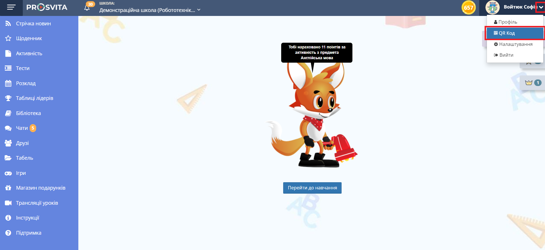 Учень повинен відкрити свій обліковий запис і вибрати опцію "QR Код".