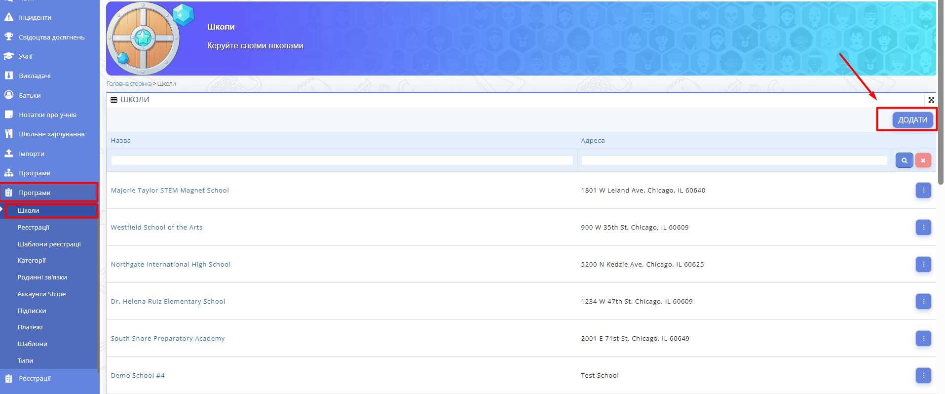 - У головному меню перейдіть до розділу Програми → Школи.