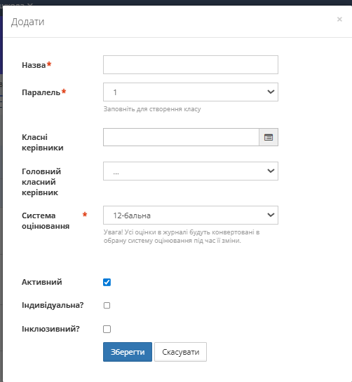 Заповніть усі необхідні поля: Назва, Паралель та Система оцінювання. Оберіть класного керівника зі списку викладачів. Поставте галочку біля пункту "Активний" та натисніть кнопку "Зберегти".
