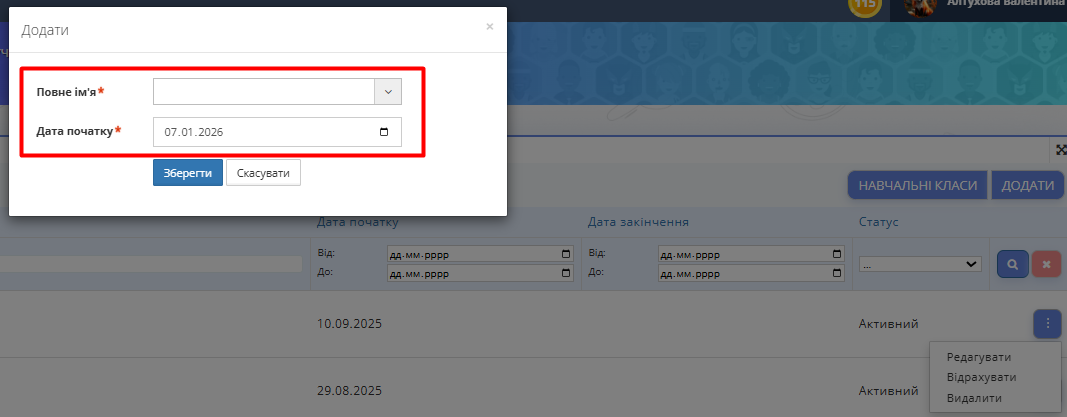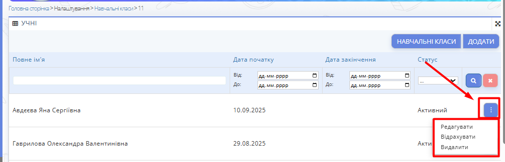 - Учня можна відрахувати, видалити або редагувати дату початку навчання у класі.